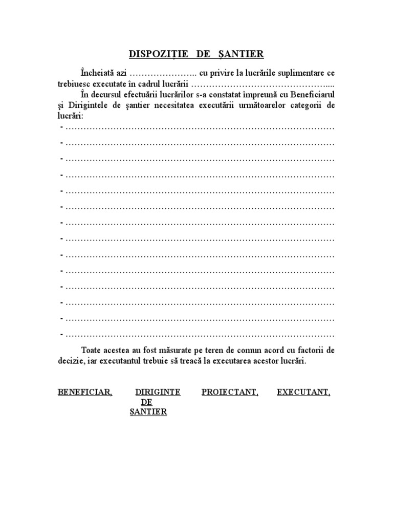 Este un document tehnic elaborat de proiectantul de specialitate prin care se permit derogari de la prevederile proiectului initial sau modificari ale elementelor constructive. Ele sunt editabile, putand fi adaptate necesitatilor dvs. Scopul general al postului este gestionarea activitatii de pe santier pentru desfasurarea in bune conditii si pentru calitatea optima a lucrarilor.