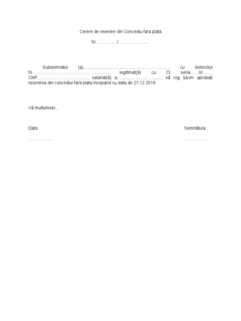 vizitati articolul complet aici : https://www.contzilla.ro/tag/concediu-fara-plata/ Download formular model de cerere concediu fara plata in format pdf, word, doc,. Află informații legislative despre concediul de odihnă, care este perioada de acordare și ce presupune. Legislația concediului fără plată pentru studii sau situații personale în anul 2019.